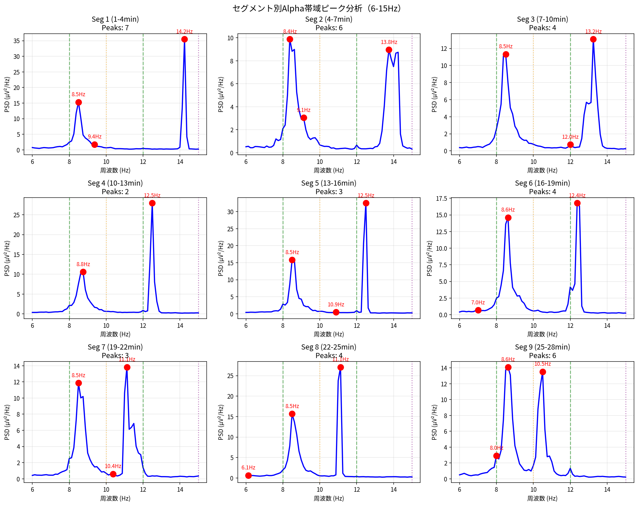 通常の瞑想では8-10Hz(Alpha帯域)が明るくなるのが典型的なパターン。でも今回は、それに加えて12-15Hzあたりも同時に活性化していた。
