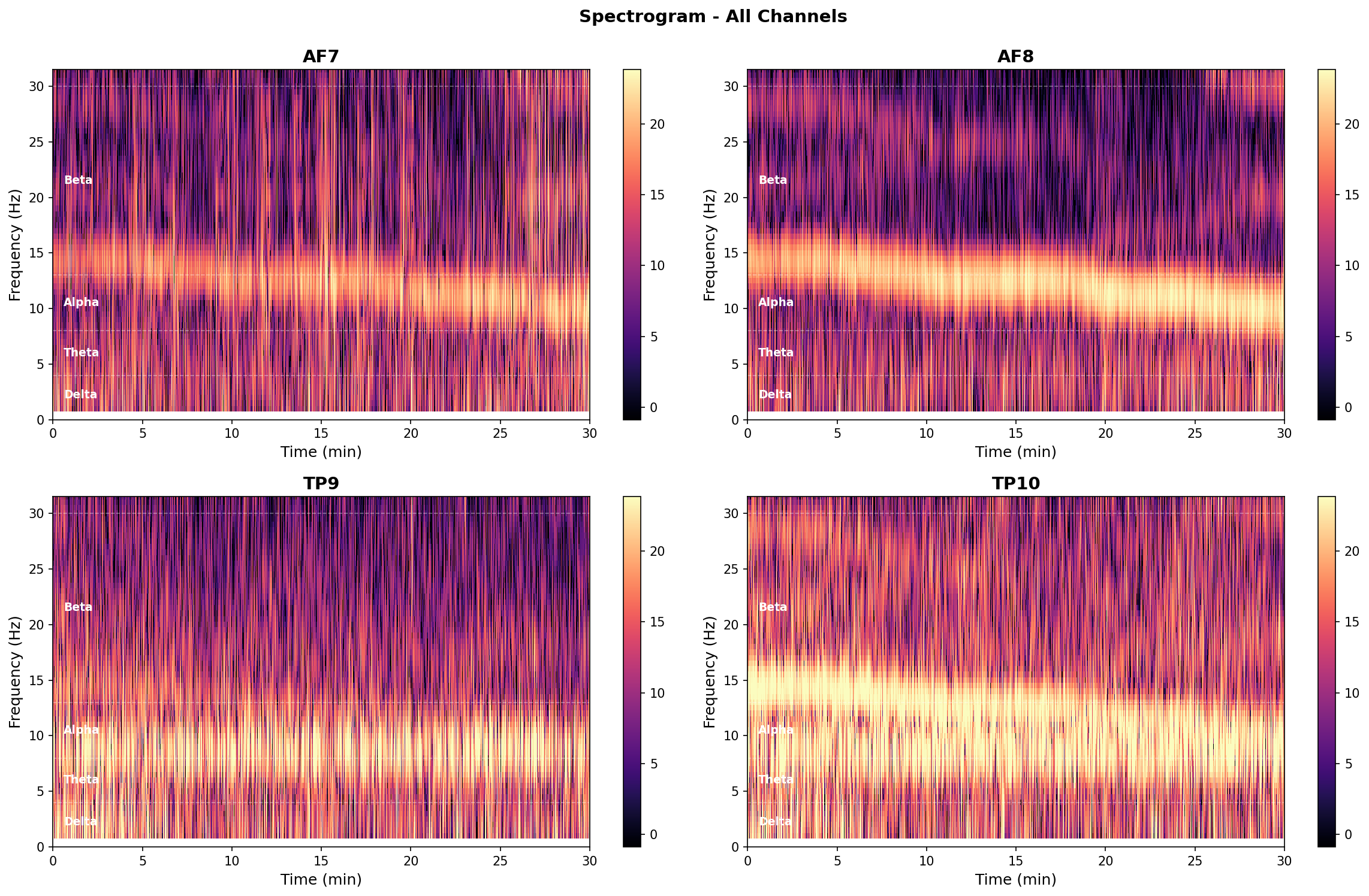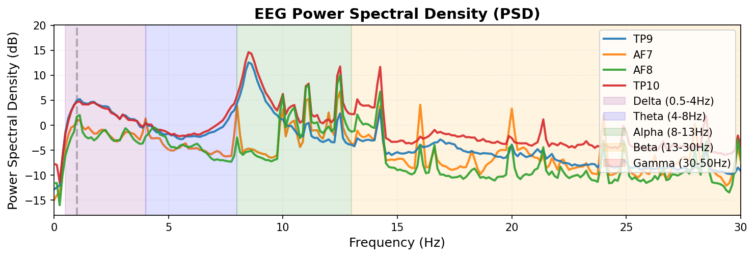 ある日の瞑想セッション(2025-12-04)のスペクトログラムを見ていたら、いつもは目立たない10-15Hz帯域がセッション全体を通じてずっと光っていた。